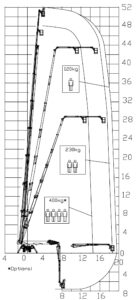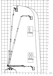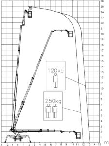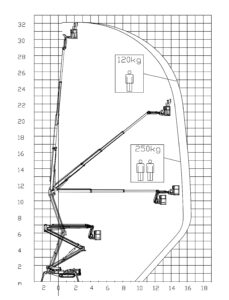 Max working height of 32 meters and max outreach of 16,5 meters at up-and-over reach of 11 meters. Large cage of 1800x70x110 mm with 120-250 kg of load capacity. Light, with stow dimensions, equipped with independent stabilizers for multiple set-up for every need, with essential design and limited encumbrance.